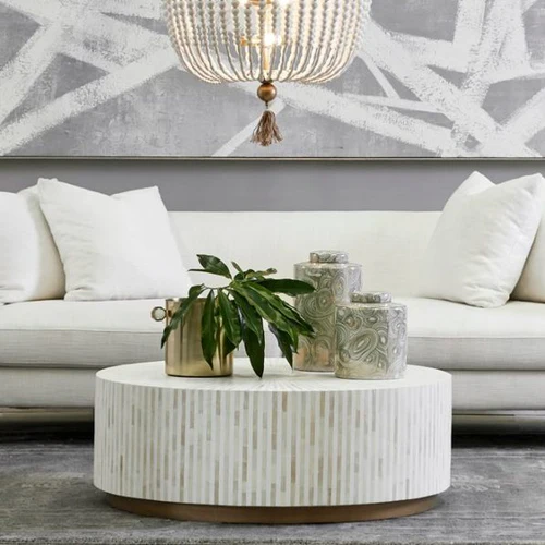 This Mother of Pearl Round Coffee Table in Ivory color adds a regal touch to any space, exuding elegance and timeless beauty. The table features an intricate floral design, complemented by a golden cylindrical base, bringing glamour and sophistication to your home.