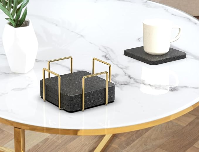 Hamaka Home Black Square Marble Coasters – Set of 4 with Stand | Handmade Stone Drink Coasters for Table, Bar & Home Décor | Vintage Marble Coaster Set with Holder (Black Granite)